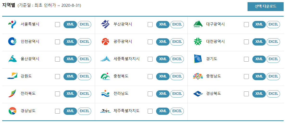 - 체크하고 우측 상단의 선택 다운로드를 클릭하면 XML 또는 EXCEL 데이터를 다운로드 가능하다.