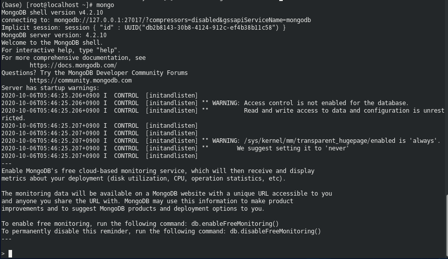 | [root@localhost ~]# mongo |