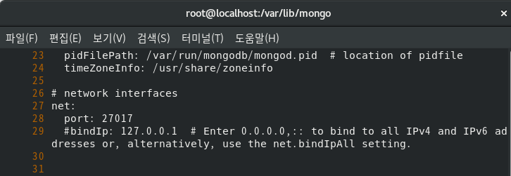 - 29번 라인의 bindIp앞에 #으로 주석처리