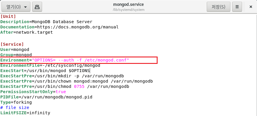 - /lib/systemd/system/mongod.service 파일 편집