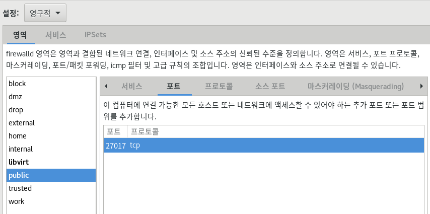 - 외부에서 접속할 수 있도록 방화벽 설정을 통해 27017번 포트를 개방해야 함
