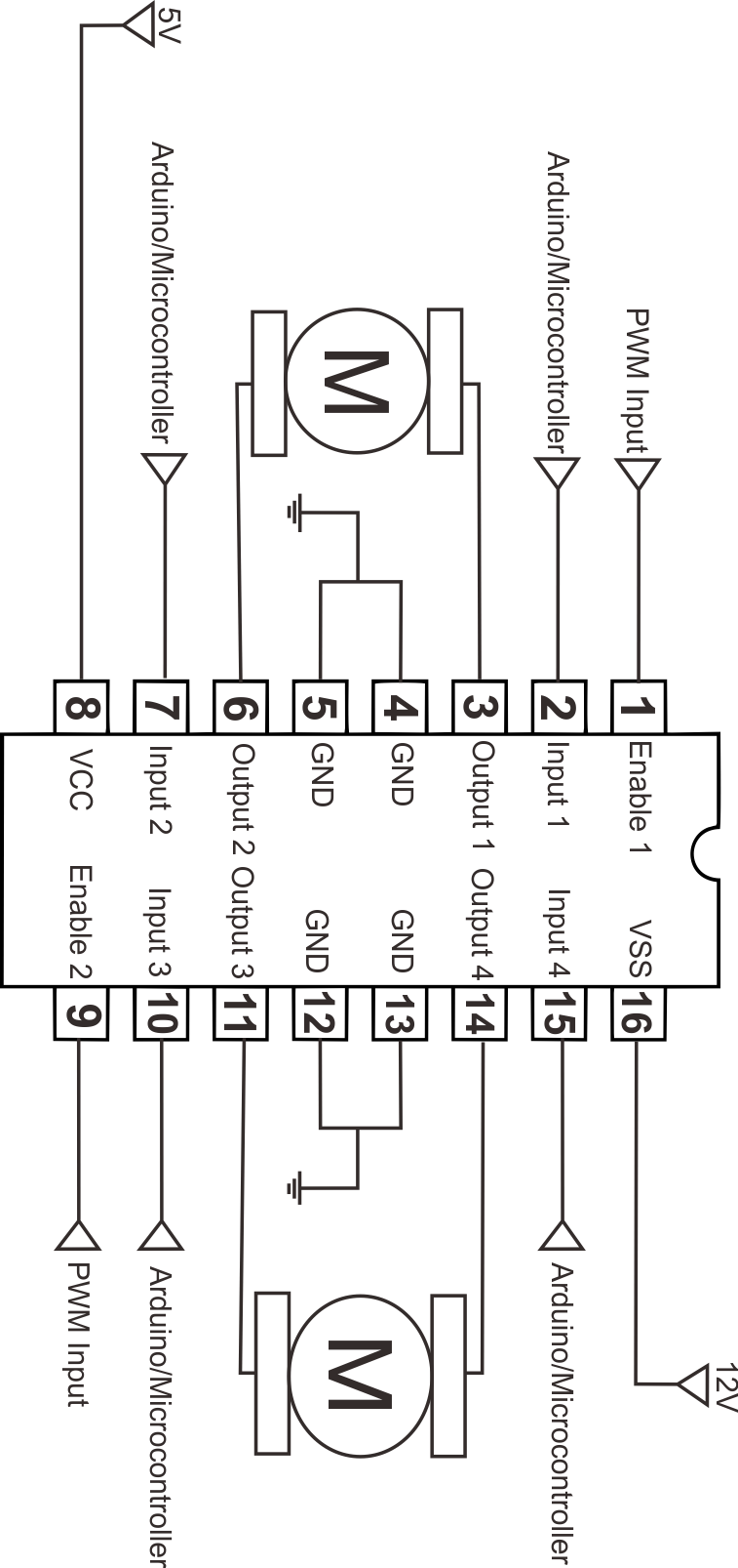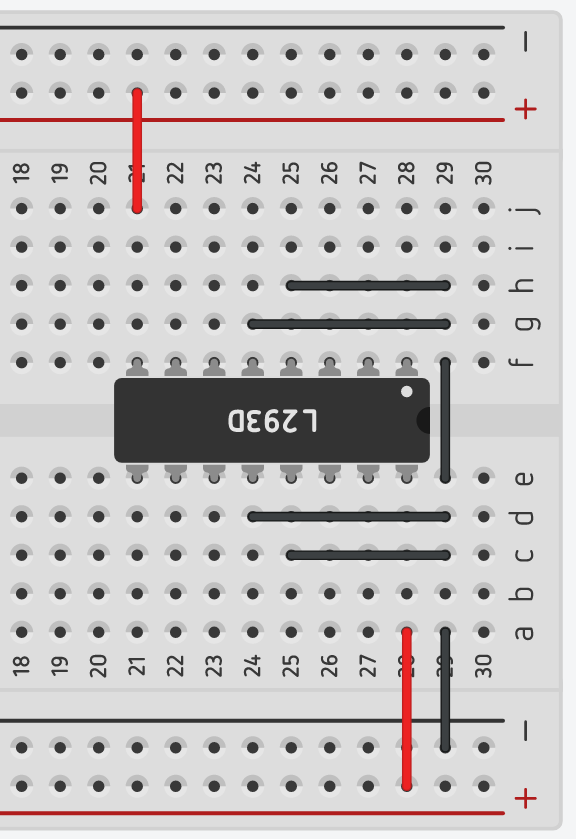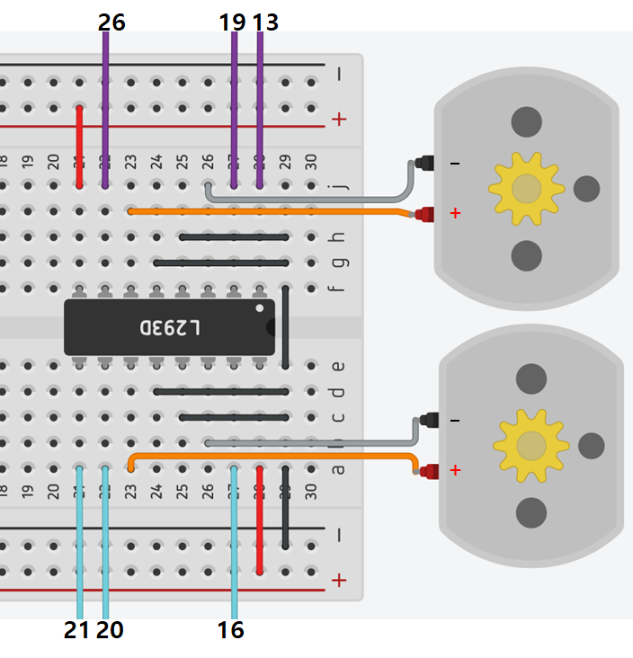 - L293D 회로 구성 (둥근 홈이 오른쪽에 위치해 있음 / 홈의 방향을 반드시 확인)
