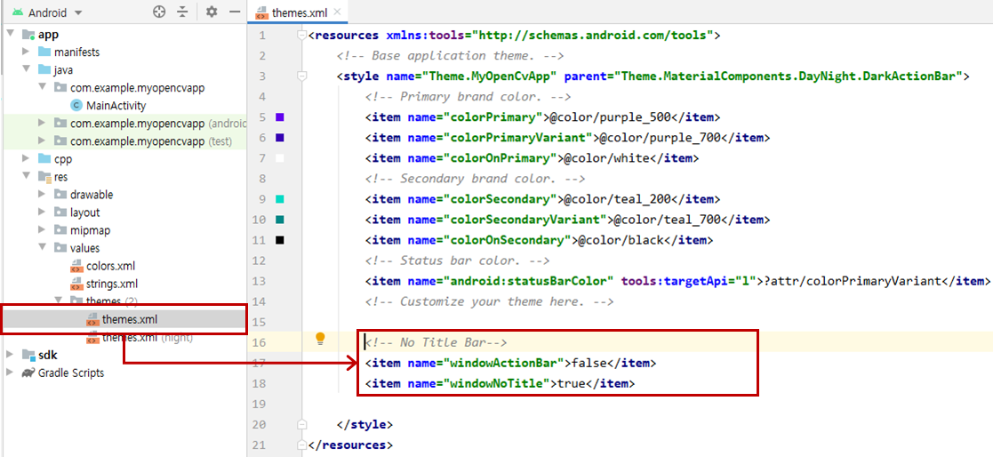 - res -> values -> themes -> themes.xml 수정