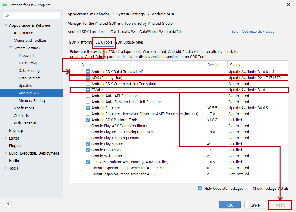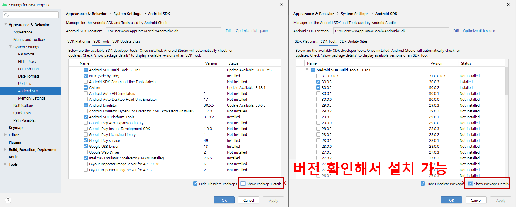 - SDK Tools ( Show Package Details 체크박스)