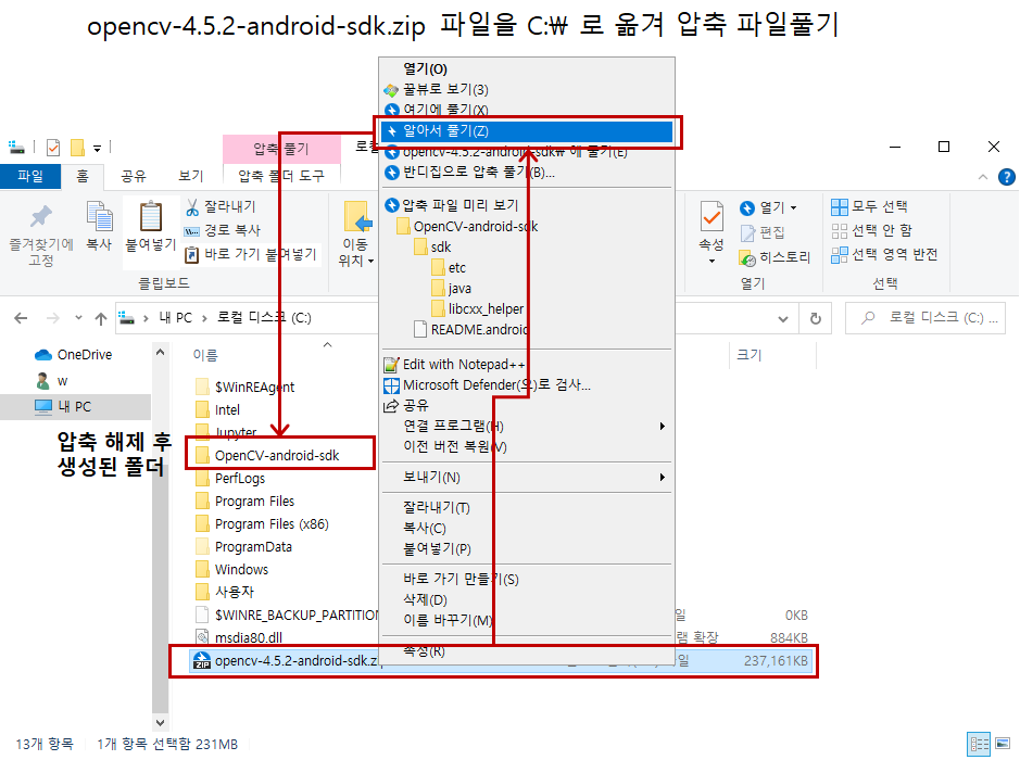 - 다운로드한 파일을 C:\ 로 복사하고 압축해제