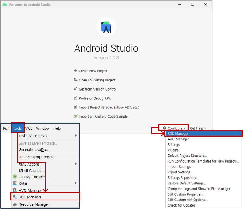 - SDK Manager : Configure -> SDK Manager