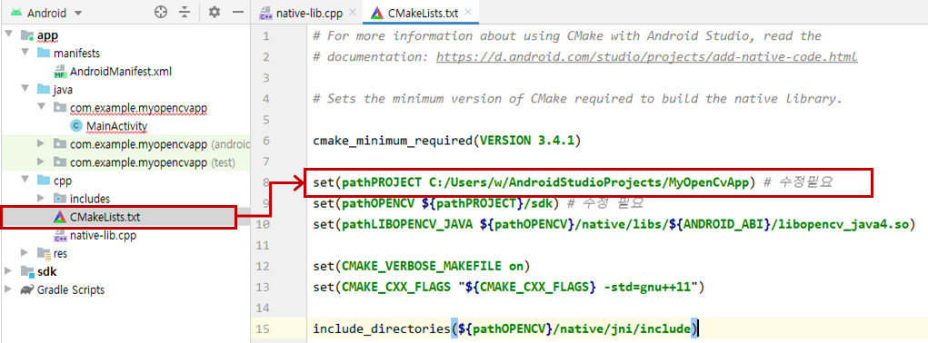 set(pathPROJECT C:/Users/w/AndroidStudioProjects/MyOpenCvApp) # 수정필요