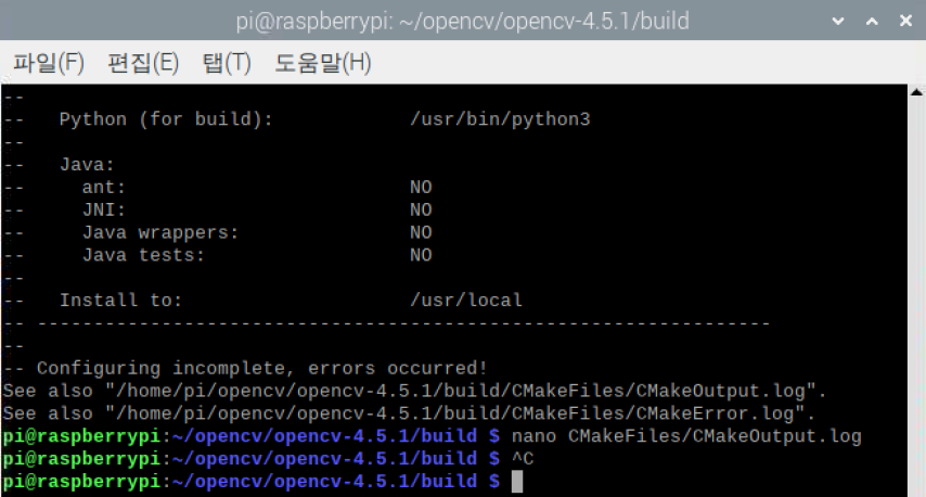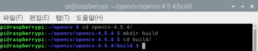 | pi@raspberrypi: ~opencv$ cd opencv-4.5.4/ pi@raspberrypi: ~/opencv/opencv-4.5.4$ mkdir build pi@raspberrypi: ~/opencv/opencv-4.5.4$ cd build pi@raspberrypi: ~/opencv/opencv-4.5.4/build$ |