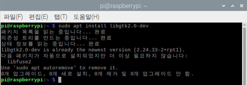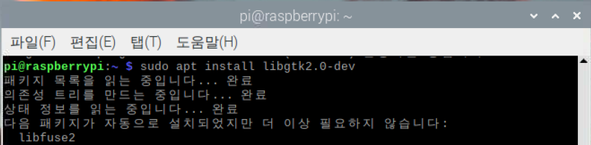 | pi@raspberrypi: ~$ sudo apt install libgtk2.0-dev |