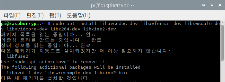 | pi@raspberrypi: ~$ sudo apt install libavcodec-dev libavformat-dev libswscale-dev libxvidcore-dev libx264-dev libxine2-dev |
