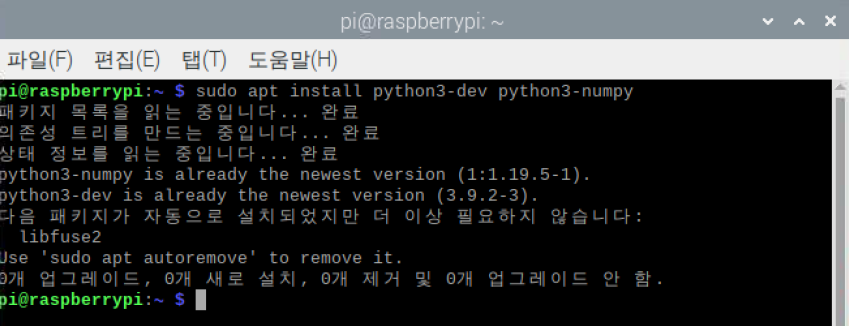 | pi@raspberrypi: ~$ sudo apt install python3-dev python3-numpy |