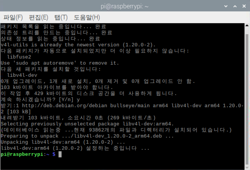 | pi@raspberrypi: ~$ sudo apt install libv4l-dev v4l-utils |