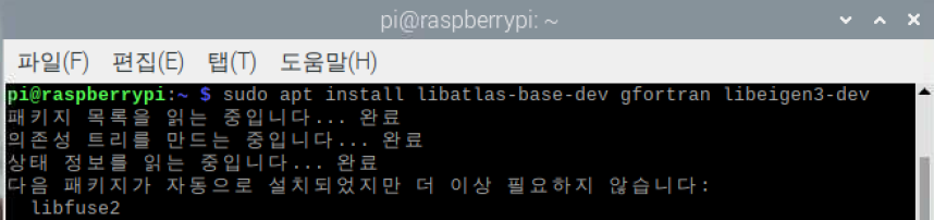 | pi@raspberrypi: ~$ sudo apt install libatlas-base-dev gfortran libeigen3-dev |