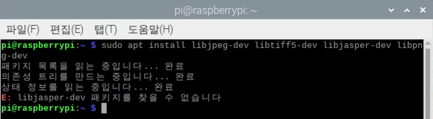 | pi@raspberrypi: ~$ sudo apt install libjpeg-dev libtiff5-dev libjasper-dev libpng-dev |