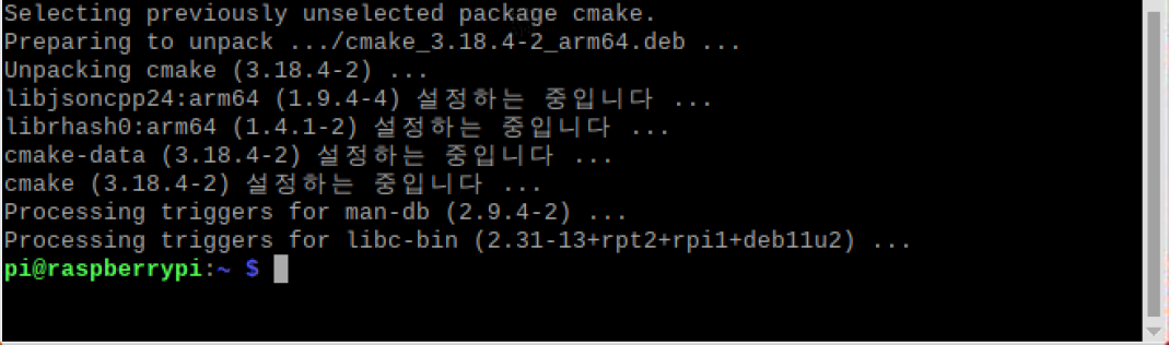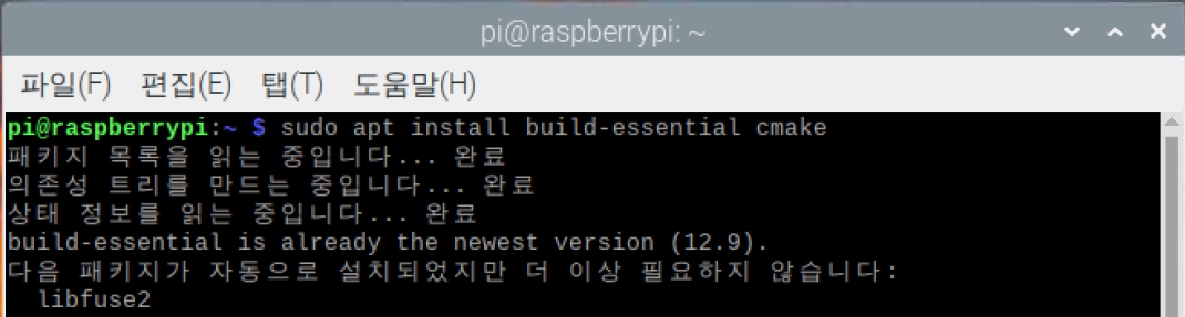 | pi@raspberrypi: ~$ sudo apt install build-essential cmake |