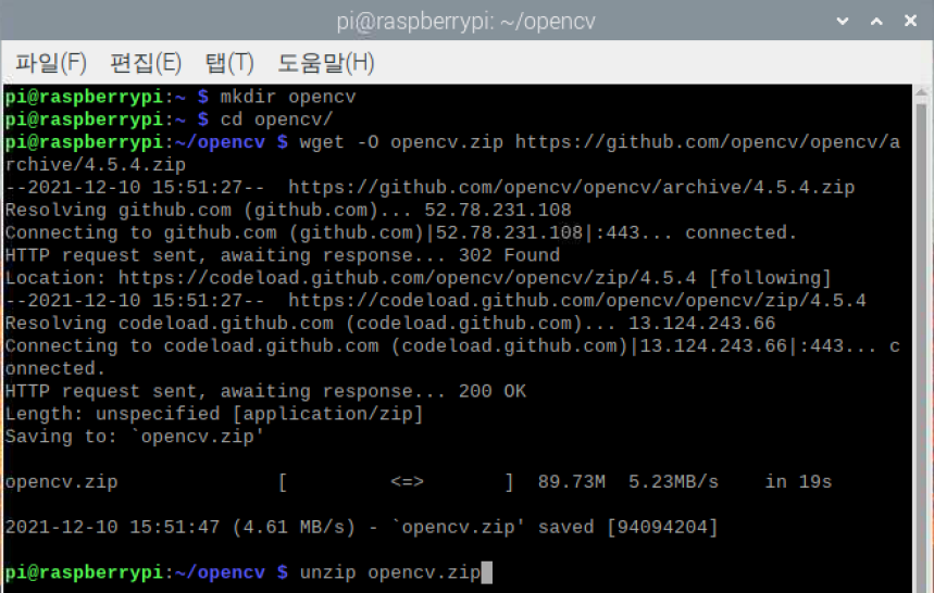 | pi@raspberrypi: ~$ wget -O opencv.zip https://github.com/opencv/opencv/archive/4.5.1.zip pi@raspberrypi: ~$ unzip opencv.zip |