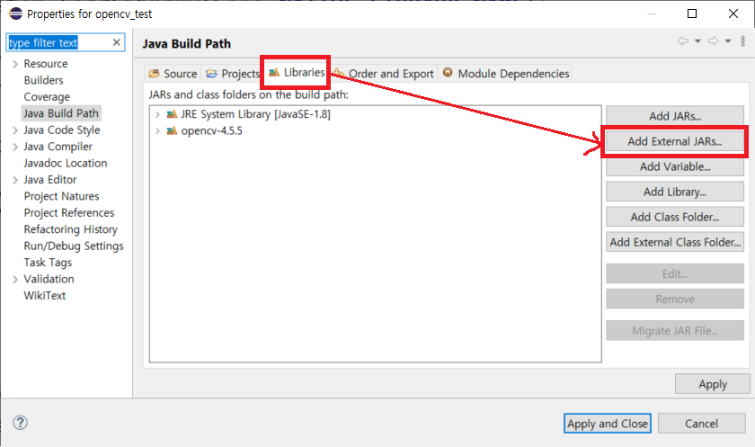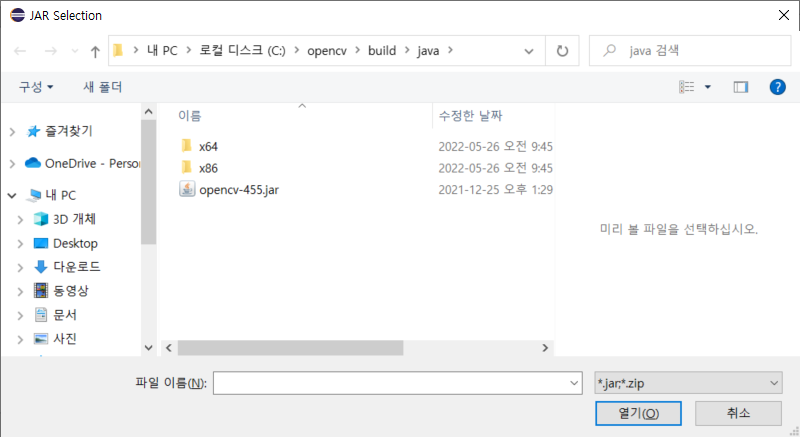 C:\opencv\build\java 경로에 있는 opencv-455.jar 추가 (현재 설치되어 있는 opencv 4.5.5)