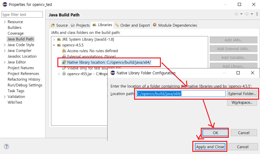 추가된 opencv 라이브러리에서 Native library location 에 opencv_java455.dll이 위치한 파일 경로 지정