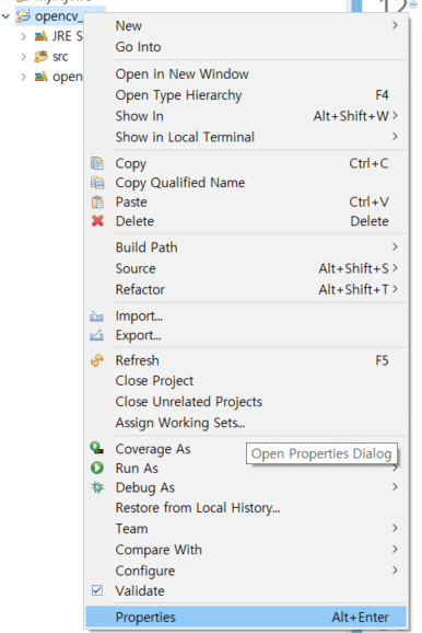 다음과 같이 opencv_test라는 프로젝트가 있을때 마우스오른쪽 -> Properties 선택