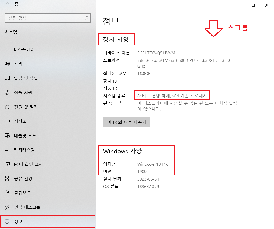 - 그러함에도 운영체제 종류 및 버전정보 그리고 몇비트 운영체제인지 확인 필요