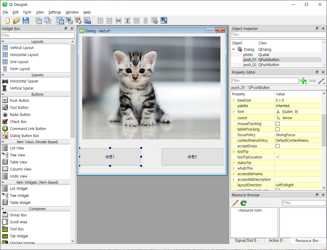 디자이너를 실행하여 test.ui파일을 생성하였다.